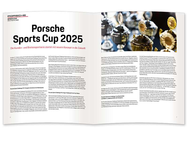 Der Porsche Sports Cup Deutschland ist Motorsport in seiner reinsten Form. Riesige Starterfelder versprechen Rennen, die an Spannung kaum zu überbieten sind. Spektakuläre Überholmanöver und nervenzerreißende Duelle werden von unseren Fotografen für das offizielle Jahrbuch genauso auf gestochen scharfen Bildern festgehalten wie das Treiben in der Boxengasse. Das Jahrbuch ist ein umfassender Rückblick auf eine unvergessliche Saison.